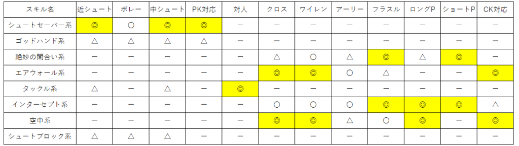 冒頭に書きましたが、いくらGKが強くても至近距離でのシュートや何度も連続でシュートを打たれると失点します。よくシュートセーバー発動したのに止められないと聞きますが、それはシュートを連続で打たれていることが原因の可能性があります。GKとCBと連携をしてシュートを打たせないようにしましょう。スキルを表にまとめました。