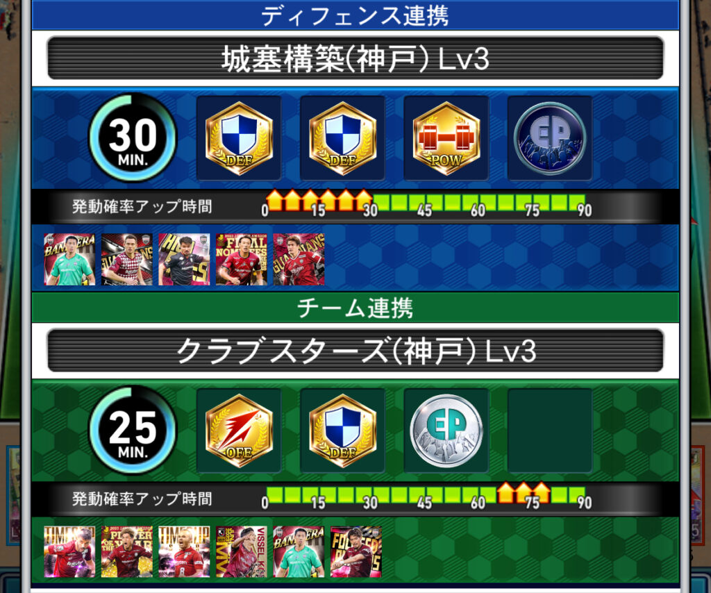 GKとCBの連携でゴールを守っていく中で「城塞構築」というディフェンス連携が存在する。これはとても強力で所持していないスキルも発動する。例えばGKが「絶妙の間合い」のスキルを持っていなくてもこのディフェンス連携が発動している時間は「絶妙の間合い」が発動する。同じチームの金枠を3枚以上揃えると発動するので狙ってみましょう。筆者のJリーグスカッドは発動していません。
